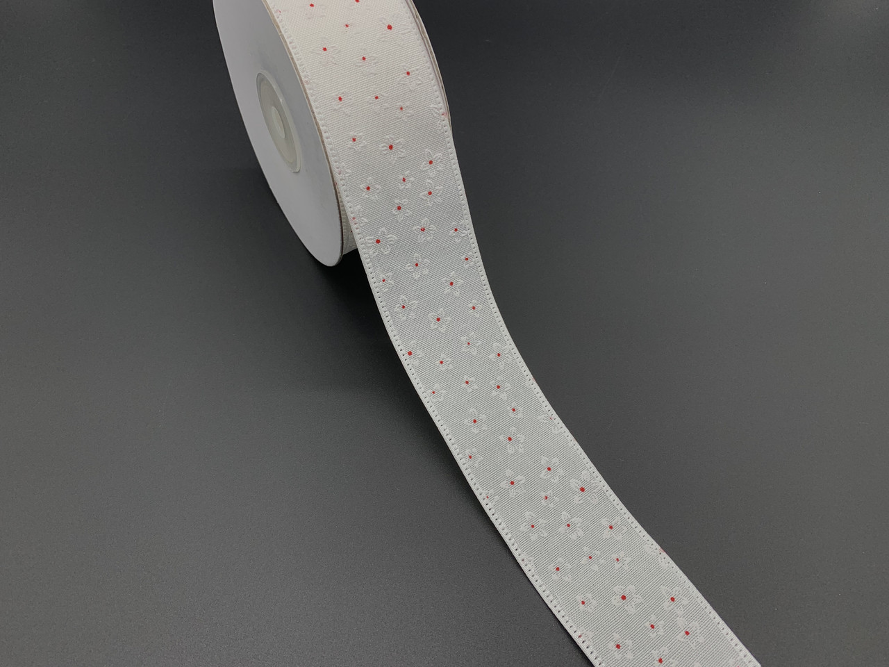 Стрічка декоративна тканинна для декупажу з малюнком Колір білий. Квітка з червоною крапкою. 4см. 20м/рул.